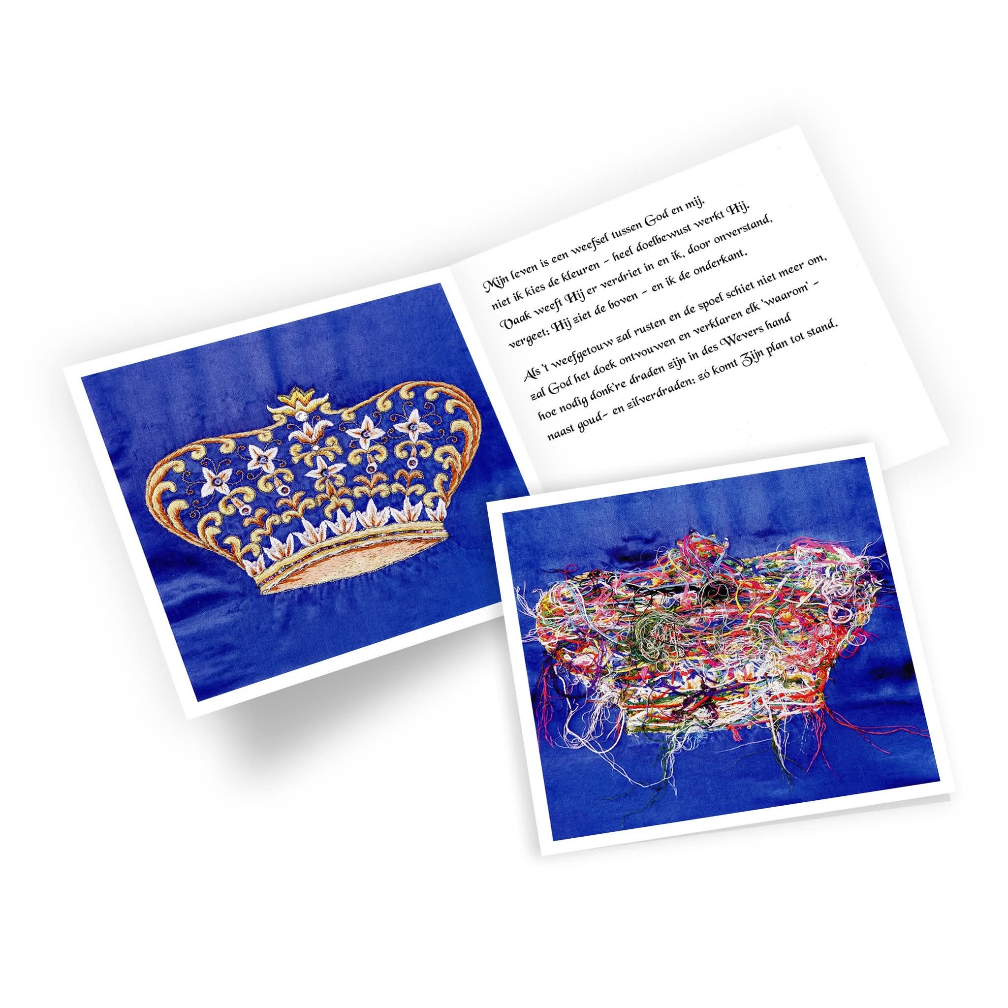 en ik de onderkant. 'Als ’t weefgetouw zal rusten en de spoel niet meer schiet om, zal God het doek ontvouwen en verklaart Hij het ‘waarom’. Hoe nodig donk’re draden zijn in des Wevers hand